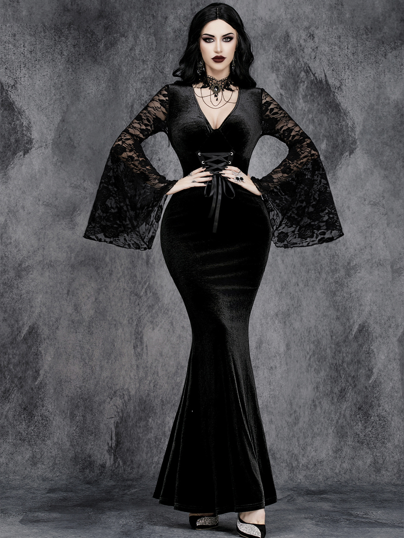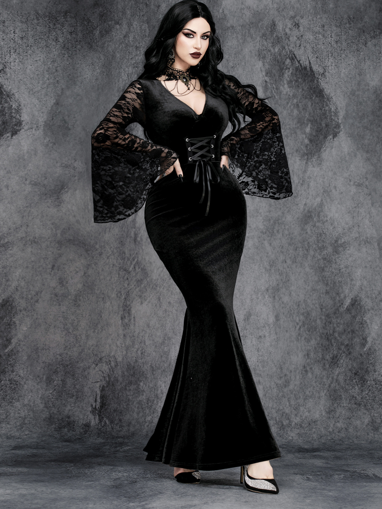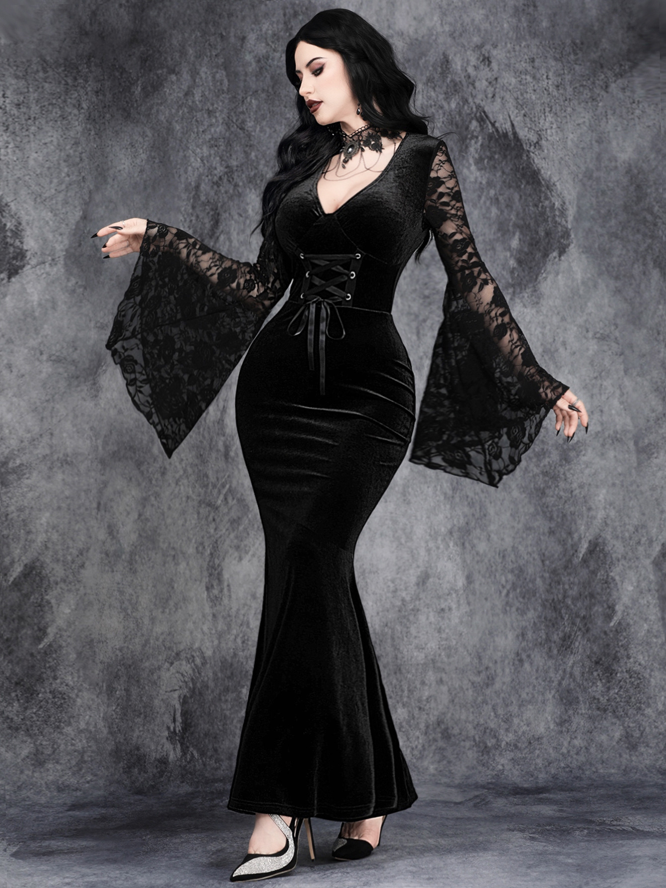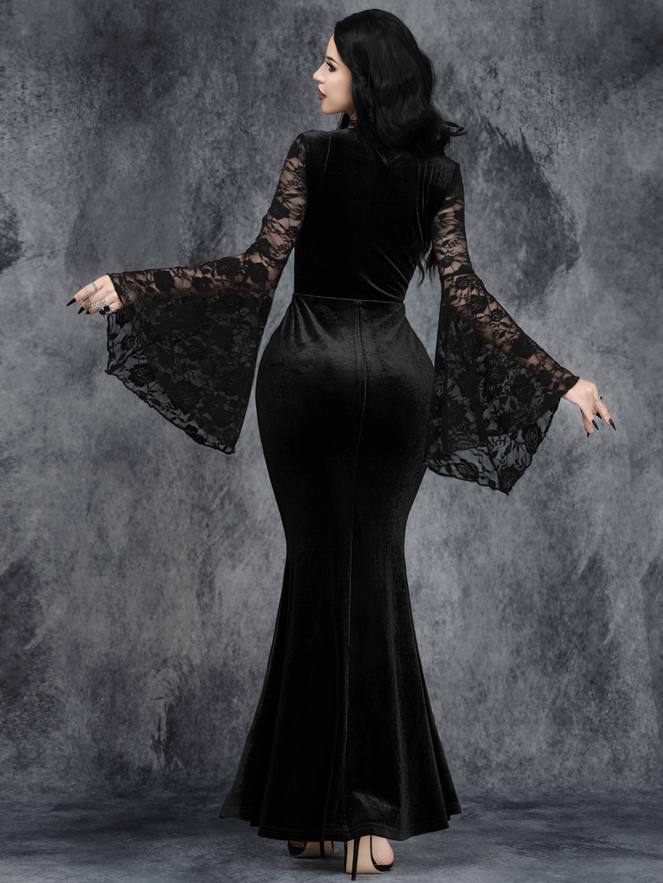 Crafted from rich black velvet and detailed with sheer floral lace bell sleeves, this dress is designed to move with you while commanding attention. The fitted silhouette hugs the body before flowing into a soft flared hem, creating an elegant gothic shape that feels both powerful and feminine.